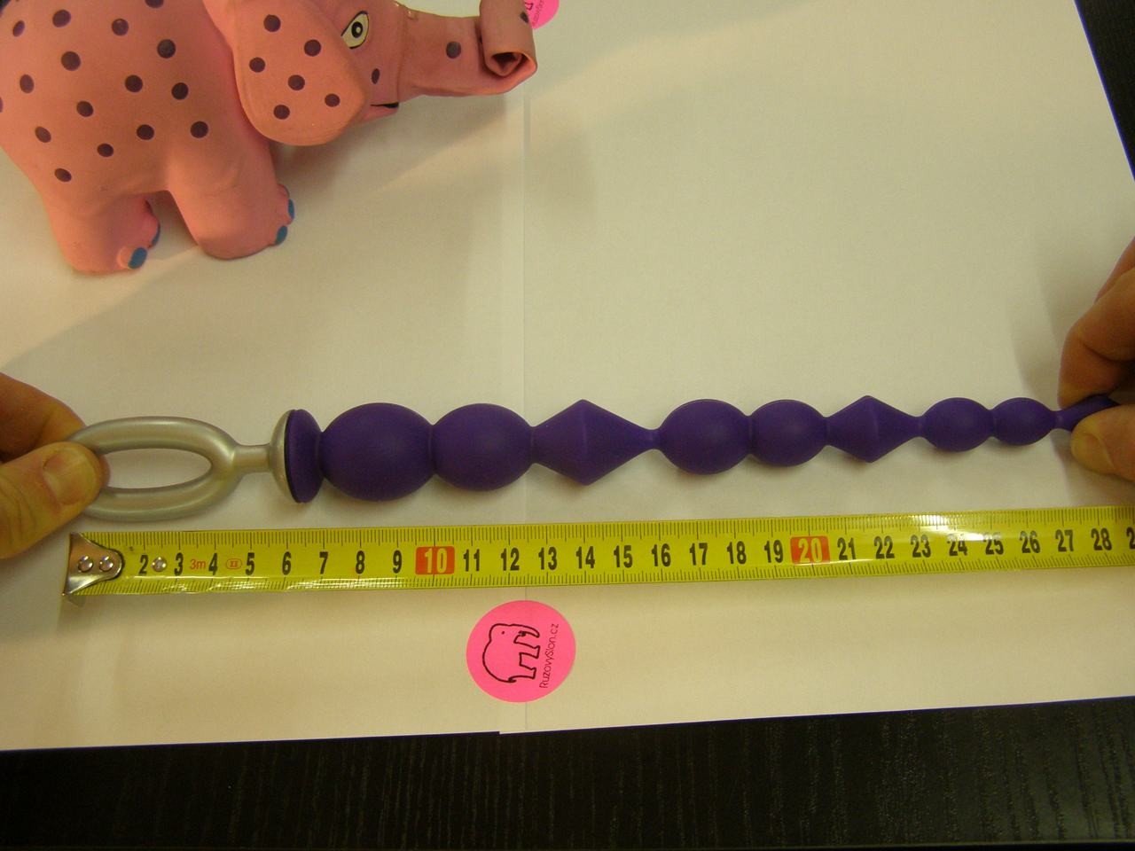 Celková použitelná délka bez ouška je 20 cm, průměr 1 až 3 cm, postupně se zvětšuje. Líbí se nám, že se narozdíl od většiny podobných pomůcek se střídá tvar diamantu se dvěmi kuličkami, což vyvolává zajímavé pocity. Uvíznutí v těle zabrání zarážka na konci a ouško pro uchopení.