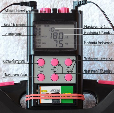 Jestliže používáme oba kanály, tak sice můžeme regulovat intenzitu u každého zvlášť, ale nastavený program a nastavené hodnoty jsou pro oba kanály společné. To je v určitých případech škoda, protože pokud stimulujeme dvě různé části těla, nemusí nám vždy vyhovovat stejný program se stejně nastavenými hodnotami. Ale to už bych za ty peníze, co přístroj stojí, chtěl opravdu mnoho.