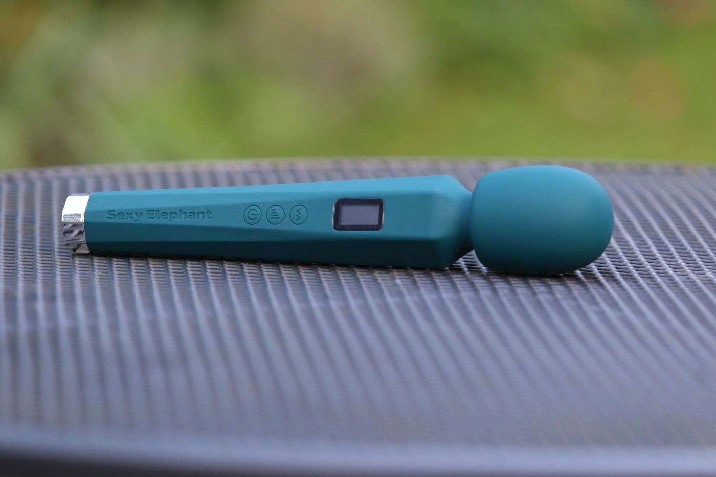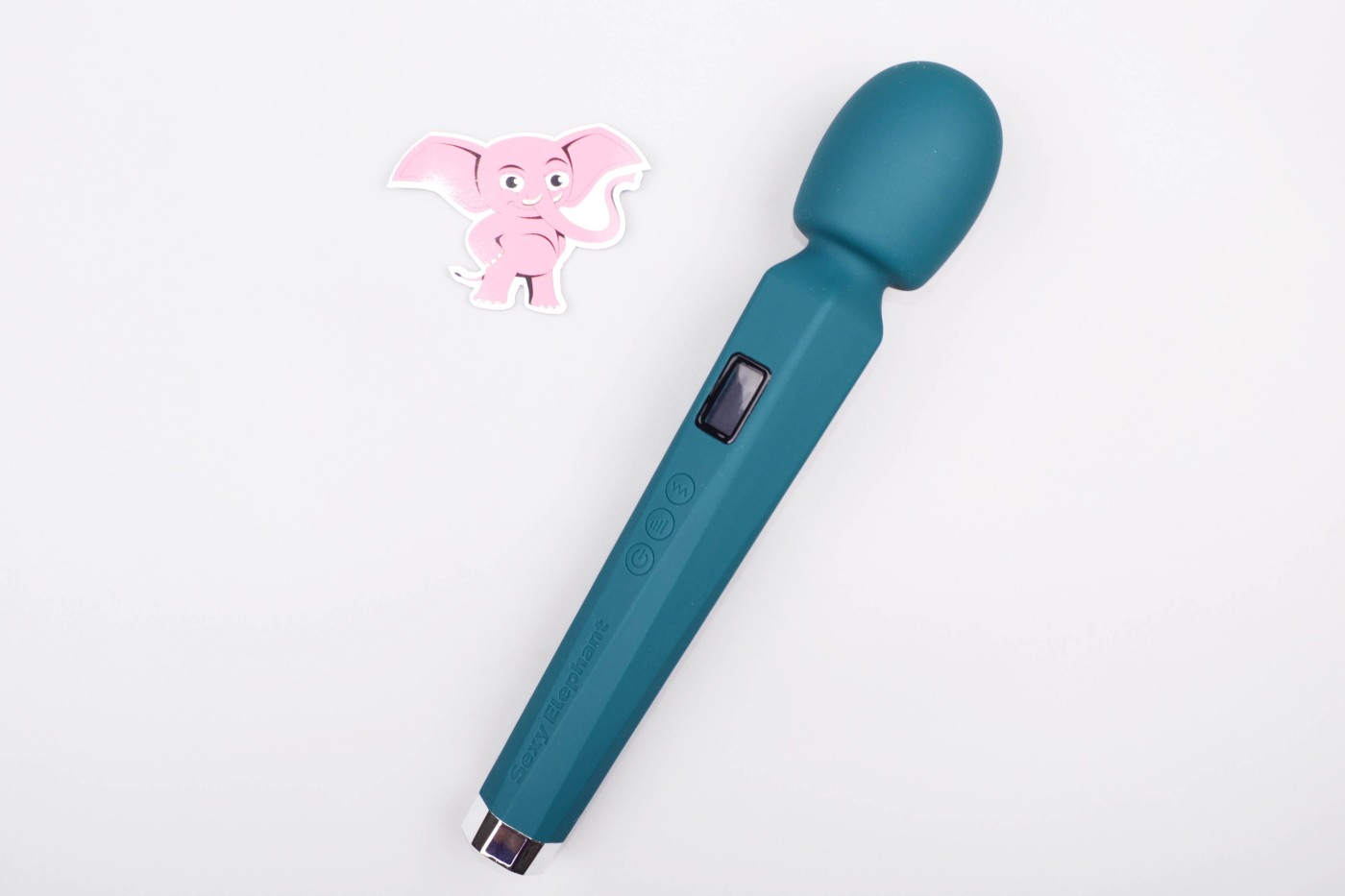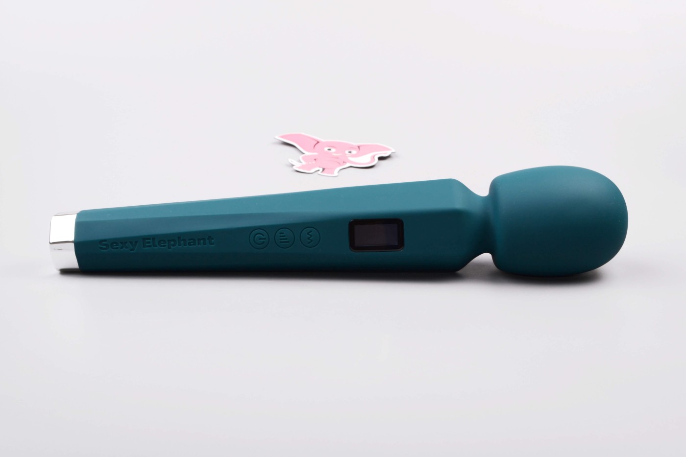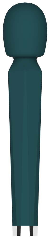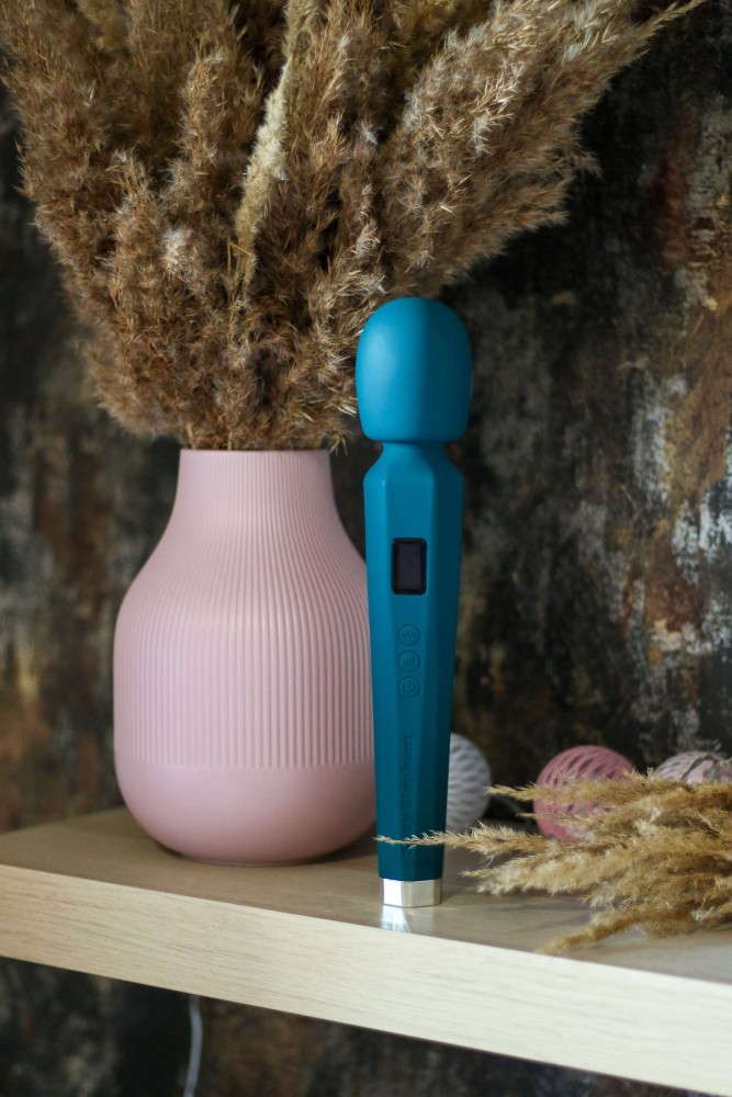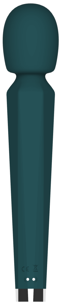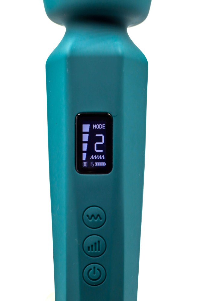 Masážní vibrátor vypadá jako mikrofon. Má kulatou hlavu, užší krk a dlouhou, hranatou rukojeť, která se dobře drží. Na přední straně najdete digitální displej a tři ovládací tlačítka. Spodní část rukojeti zdobí stříbrná koncovka, která hezky ladí s tmavě tyrkysovou barvou pomůcky. Celkově hračka působí moderně a luxusně.