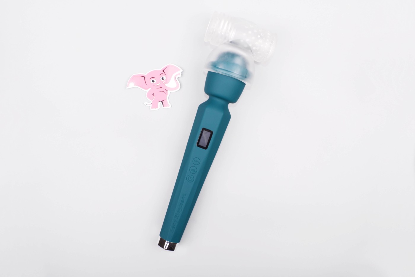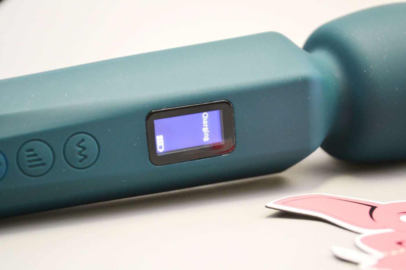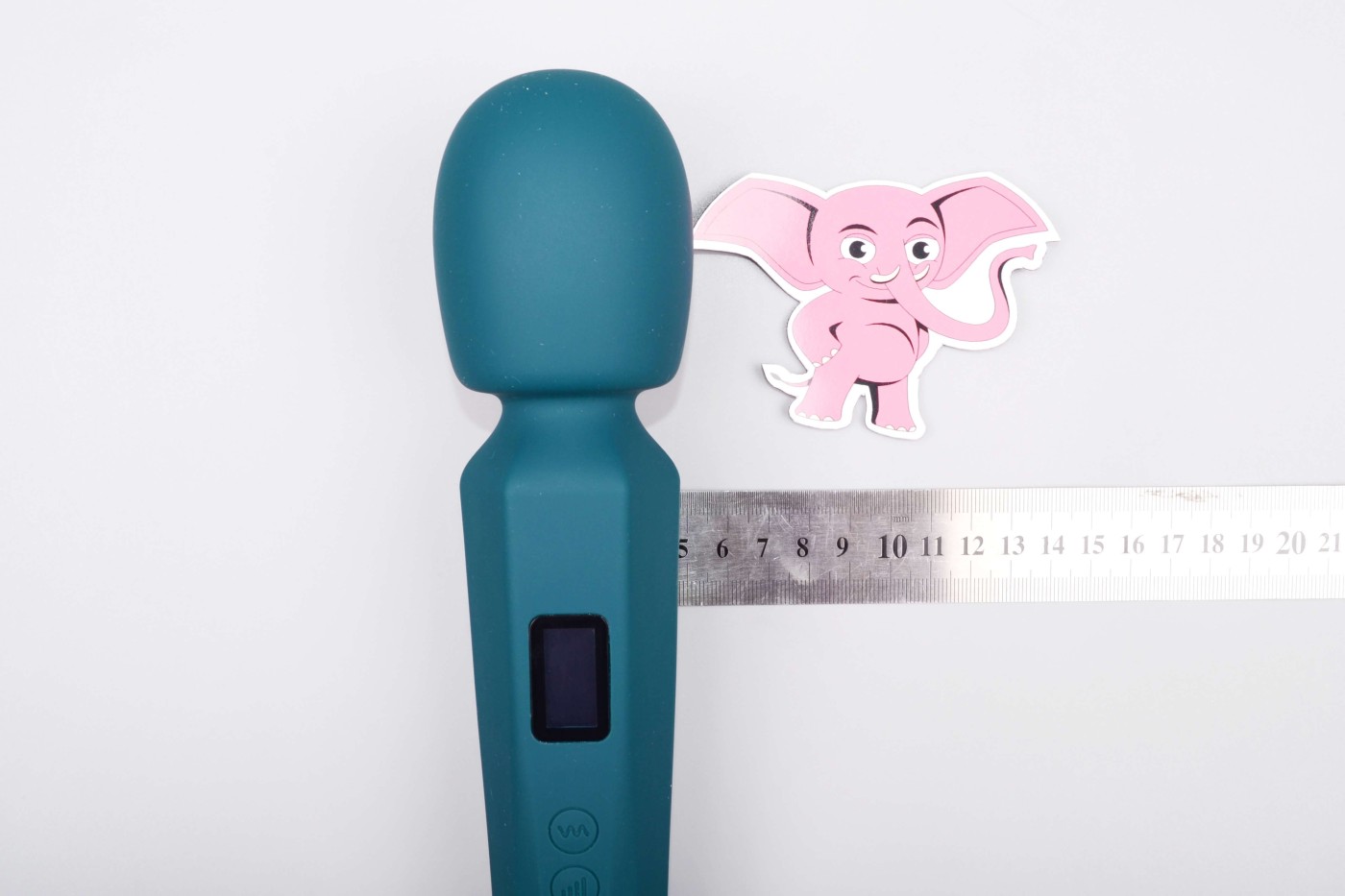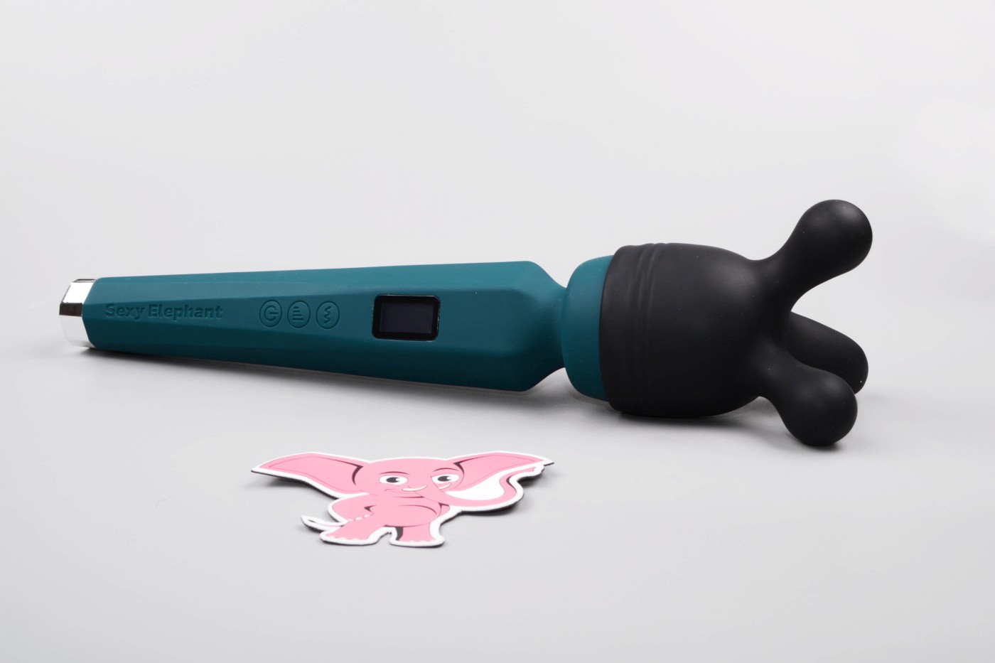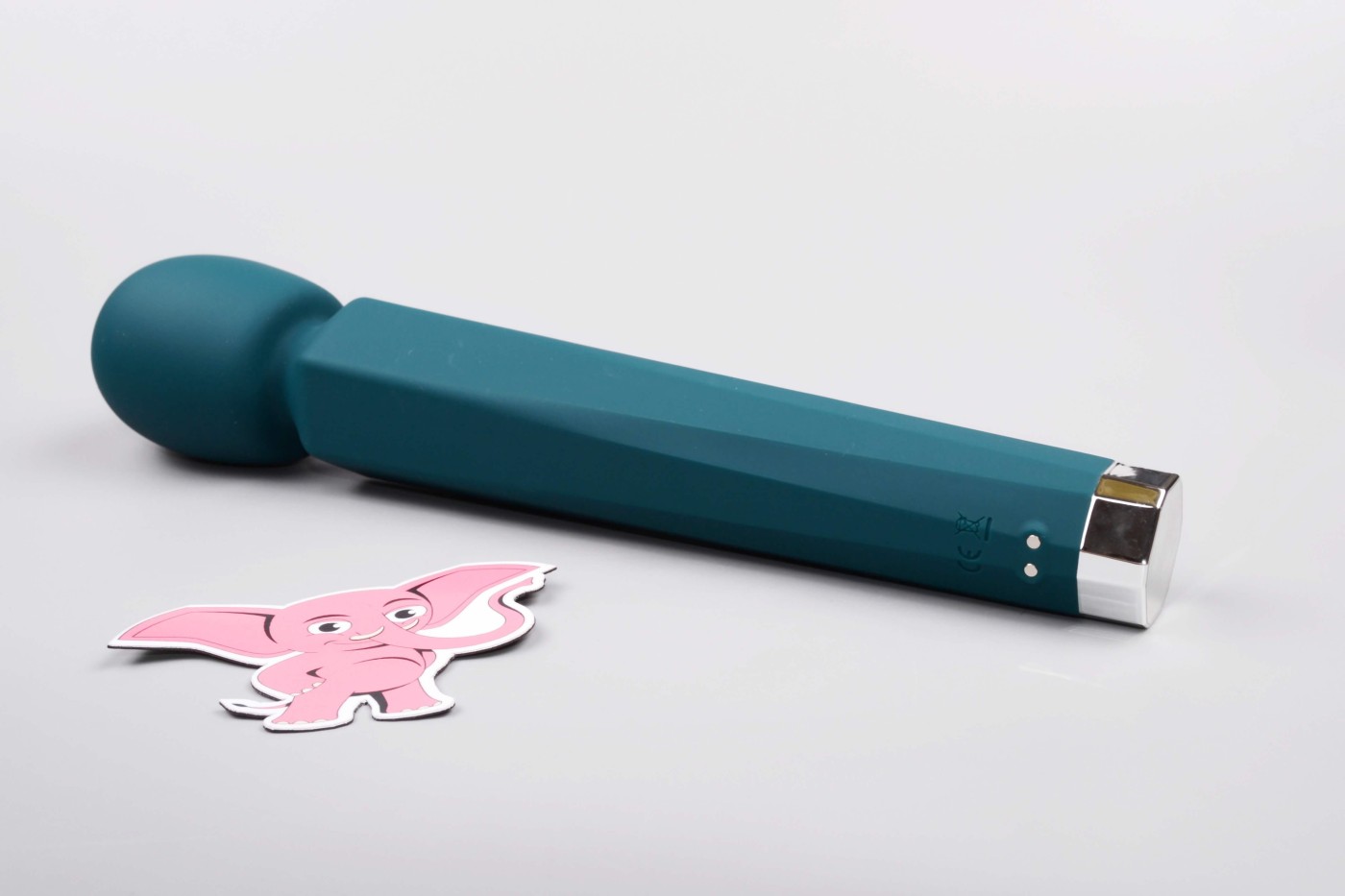 Masážní vibrátor vypadá jako mikrofon. Má kulatou hlavu, užší krk a dlouhou, hranatou rukojeť, která se dobře drží. Na přední straně najdete digitální displej a tři ovládací tlačítka. Spodní část rukojeti zdobí stříbrná koncovka, která hezky ladí s tmavě tyrkysovou barvou pomůcky. Celkově hračka působí moderně a luxusně.