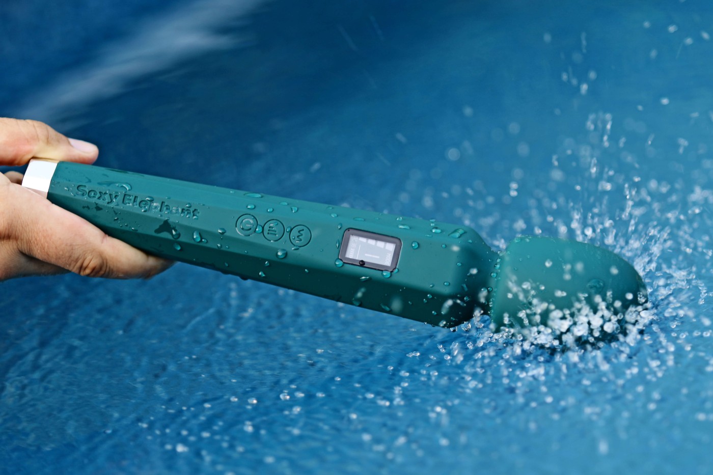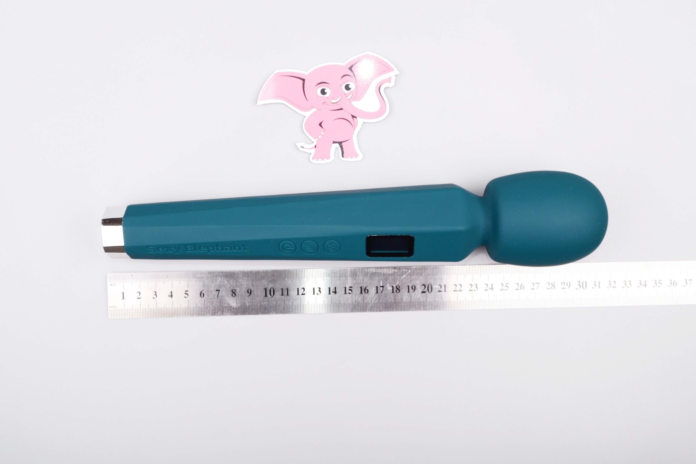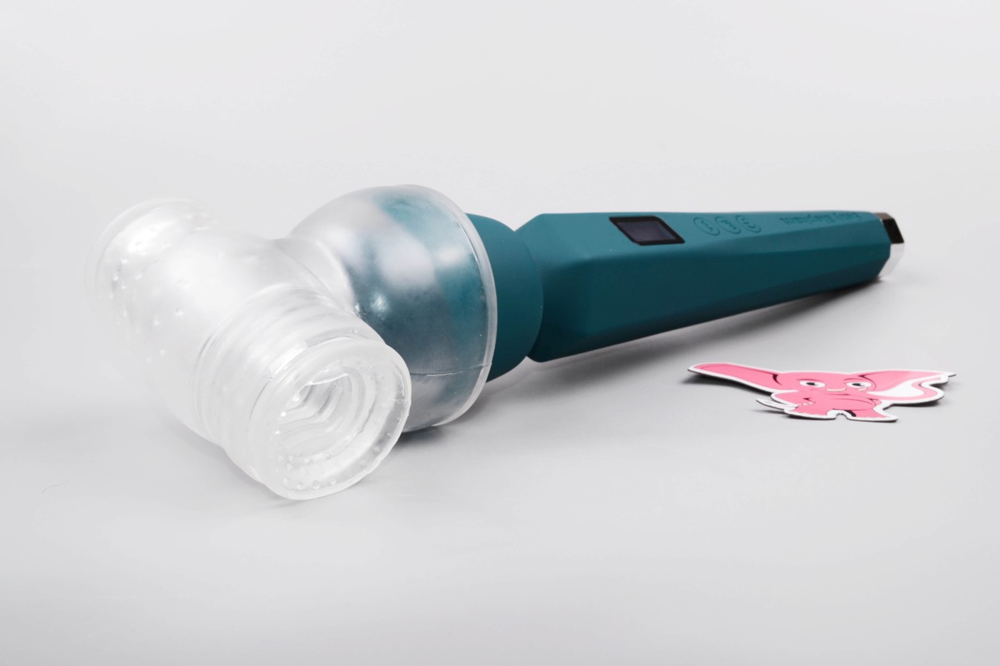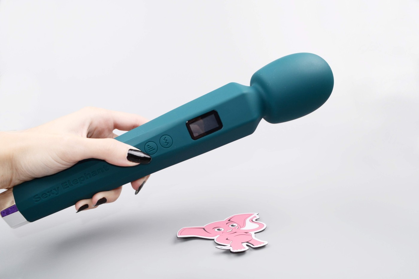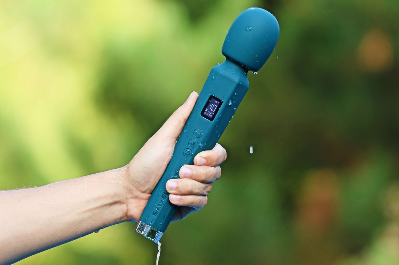 Masážní vibrátor vypadá jako mikrofon. Má kulatou hlavu, užší krk a dlouhou, hranatou rukojeť, která se dobře drží. Na přední straně najdete digitální displej a tři ovládací tlačítka. Spodní část rukojeti zdobí stříbrná koncovka, která hezky ladí s tmavě tyrkysovou barvou pomůcky. Celkově hračka působí moderně a luxusně.