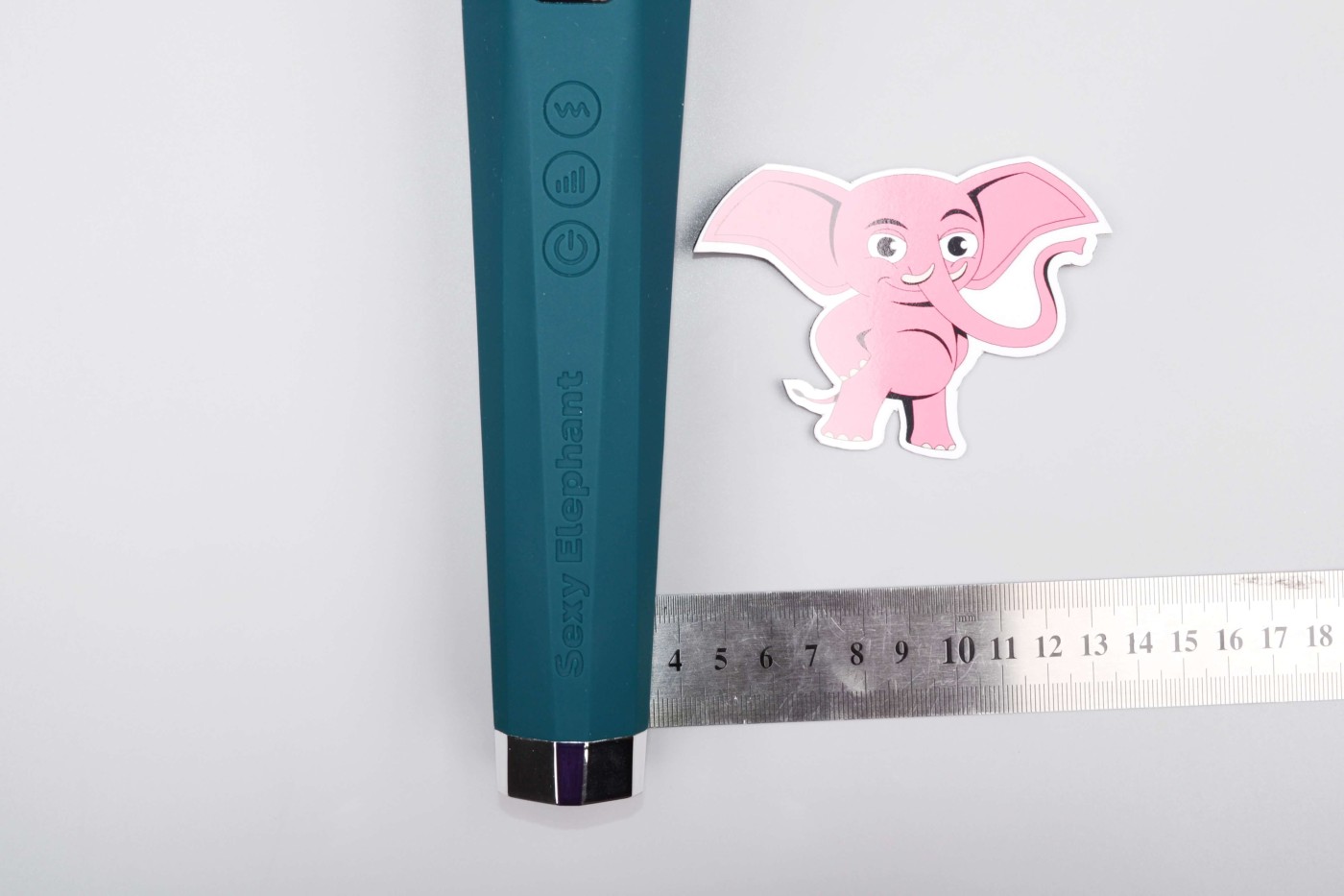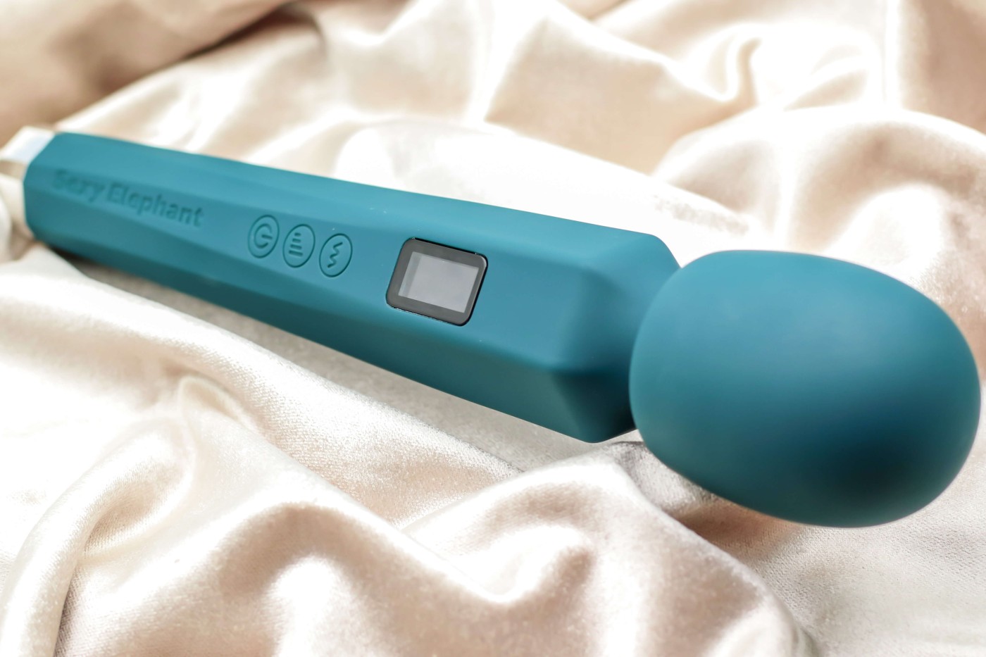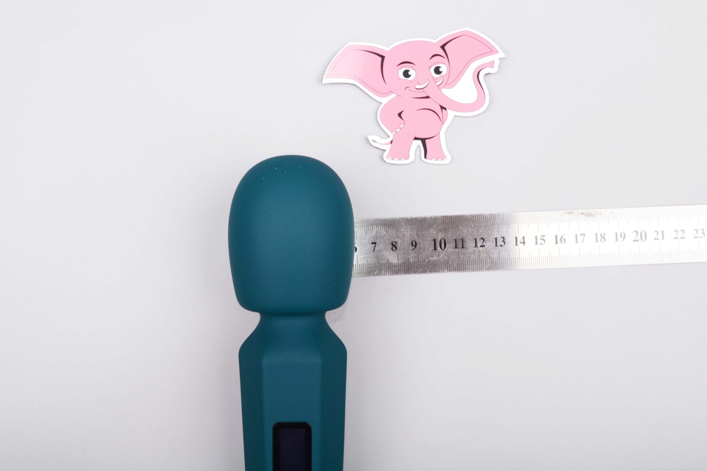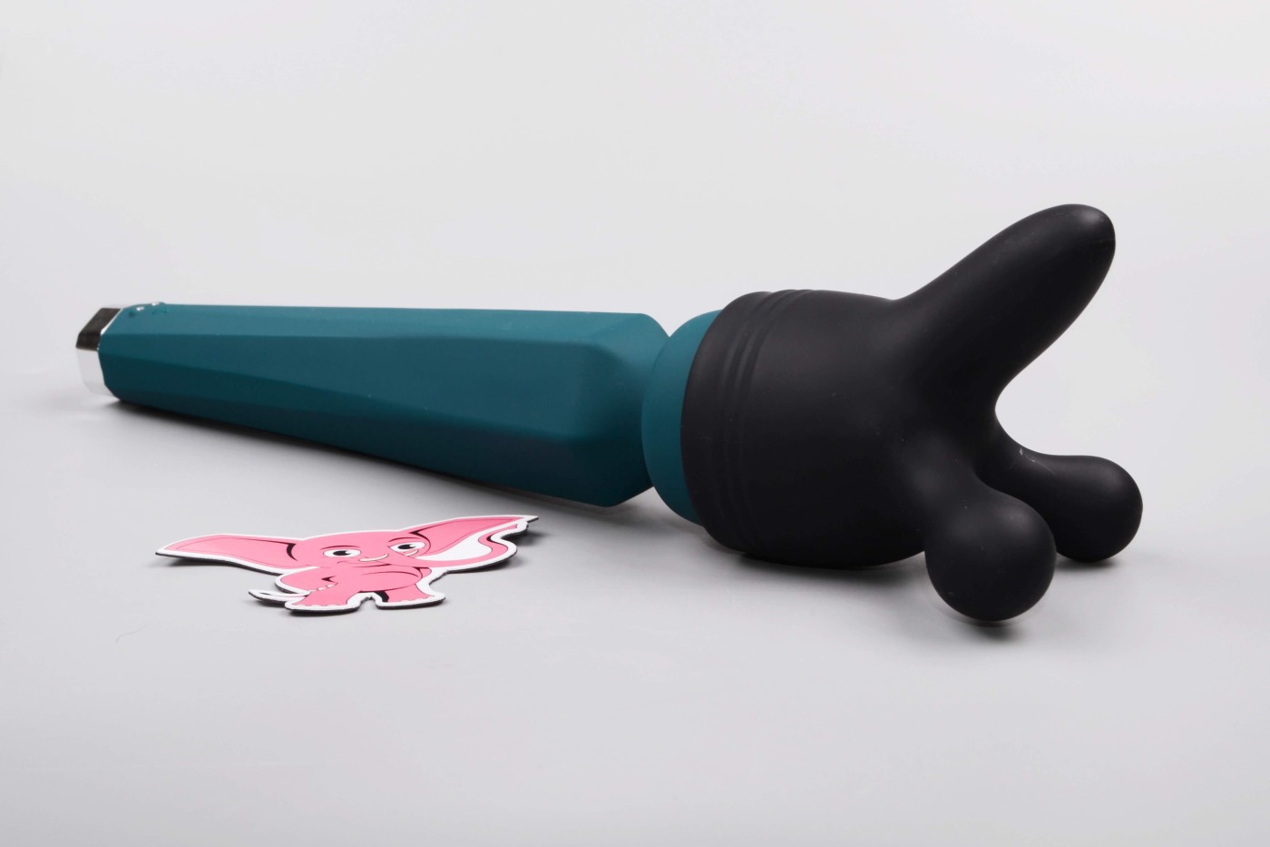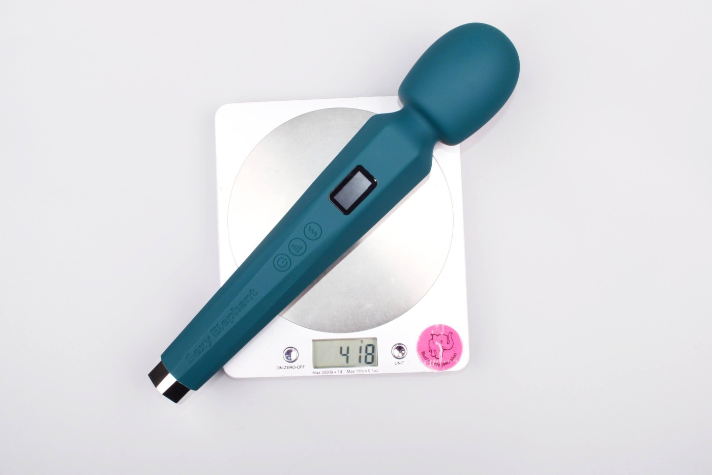 Masážní vibrátor vypadá jako mikrofon. Má kulatou hlavu, užší krk a dlouhou, hranatou rukojeť, která se dobře drží. Na přední straně najdete digitální displej a tři ovládací tlačítka. Spodní část rukojeti zdobí stříbrná koncovka, která hezky ladí s tmavě tyrkysovou barvou pomůcky. Celkově hračka působí moderně a luxusně.
