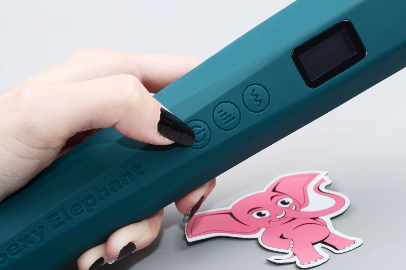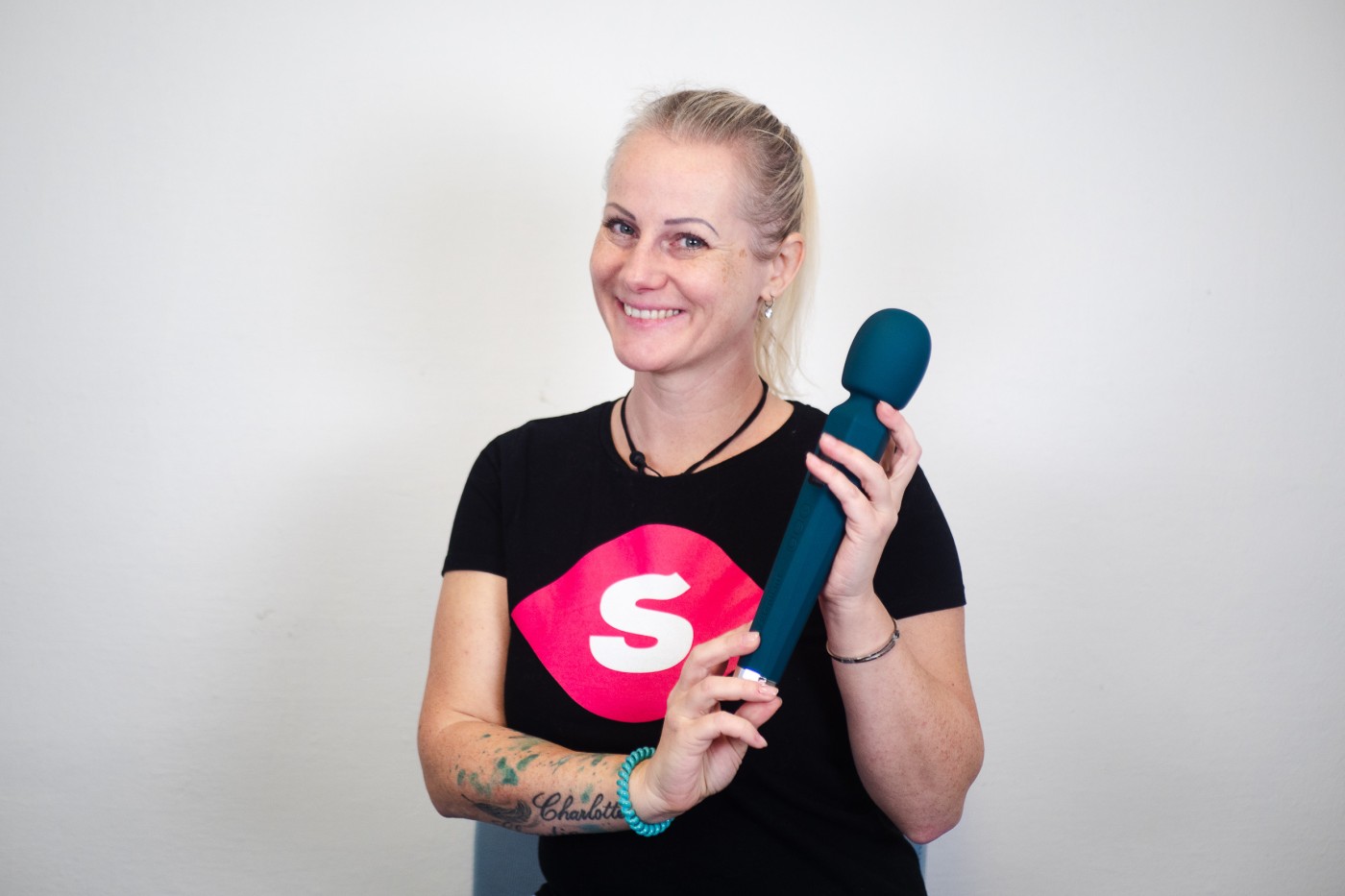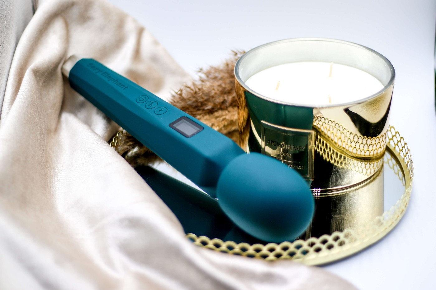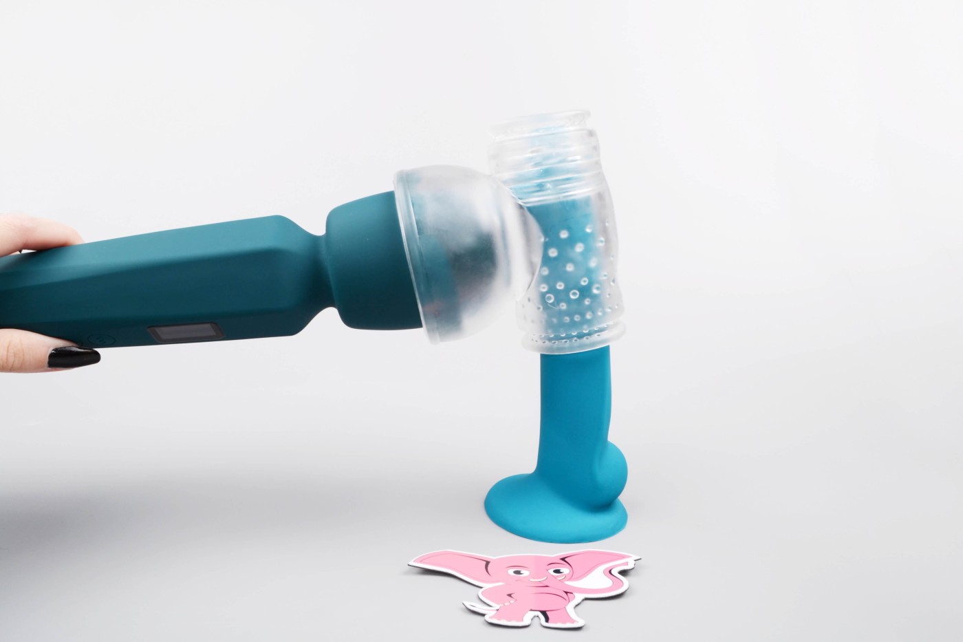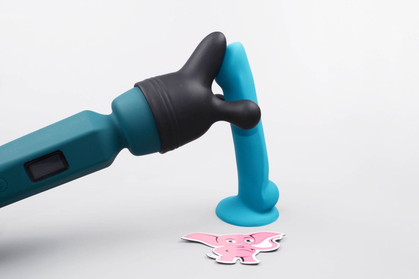 Masážní vibrátor vypadá jako mikrofon. Má kulatou hlavu, užší krk a dlouhou, hranatou rukojeť, která se dobře drží. Na přední straně najdete digitální displej a tři ovládací tlačítka. Spodní část rukojeti zdobí stříbrná koncovka, která hezky ladí s tmavě tyrkysovou barvou pomůcky. Celkově hračka působí moderně a luxusně.