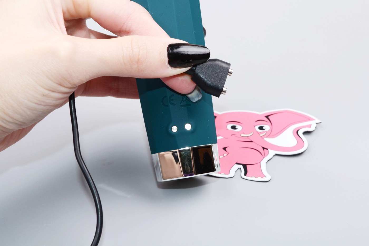 Výrobce sice posílá pomůcku z cca 1/2 nabitou, přesto ji doporučujeme před prvním použitím dobít do plna, abyste prodloužili životnost i výdrž baterie. Hračku nabijete pomocí magnetického USB kabelu, který najdete v balení. Kulatou koncovku přiložte ke dvěma stříbrným bodům, který najdete na zadní straně rukojeti, těsně nad jejím spodním stříbrným lemem. Druhý konec kabelu pak připojte k powerbance nebo přes síťový adaptér do elektrické zásuvky. Během nabíjení uvidíte na digitálním displeji nápis "Charging" a ve spodní části displeje uvidíte blikat jednotlivé články v ikonce baterie. Jakmile se pomůcka dobije, objeví se na displeji nápis "Charged". Nabíjení trvá cca 3 hodiny, po kterých vydrží hračka vibrovat až 2 hodiny vkuse (záleží na zvolené intenzitě vibrací).