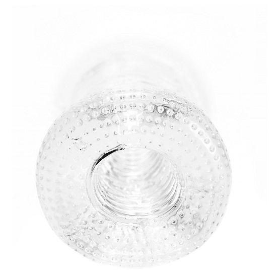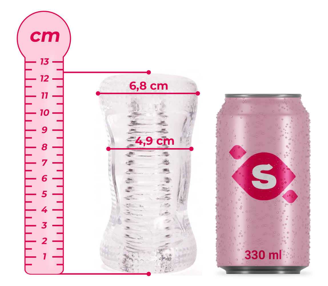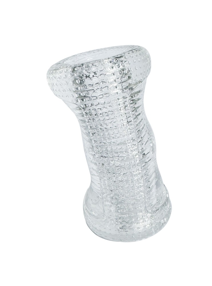 Nenápadný válcovitý tvar masturbátoru v průhledné barvě vypadá jako skleněný tunel. Svou velikostí perfektně padne do ruky. Na obou stranách najdeme otvor. Jeden je trochu větší a simuluje vaginální vchod, zatímco ten druhý, menší a užší, evokuje sevřený zadeček.