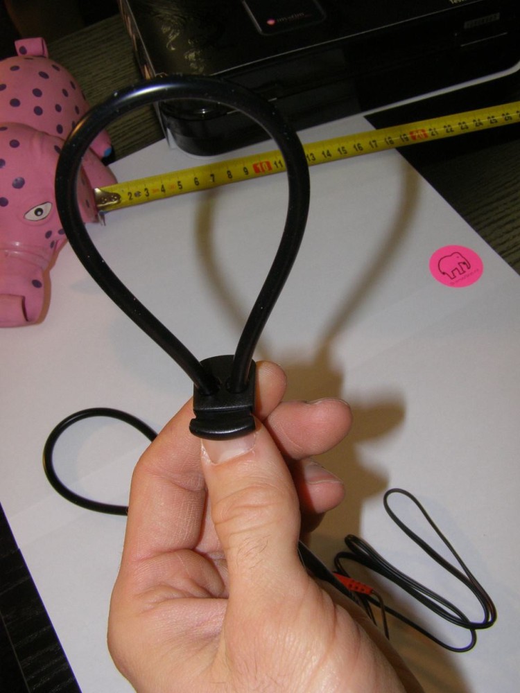 MyStim Rodeo je vyroben ze silikonu, je to vlastně dutá hadička o Ø 5 mm. Ta je protáhnuta dvěma otvory v plastové brzdičce a vytvoří nám tak smyčku. Plastová brzdička slouží k aretaci po nastavení velikosti smyčky. Délka hadičky jednoho „lasa“ je zhruba 38 cm (bez vodičů). V balení nalezneme kromě dvou „las“ také jeden dvoužilový kablík s konektorem pro zasunutí do ES přístroje Mystim (viz foto).