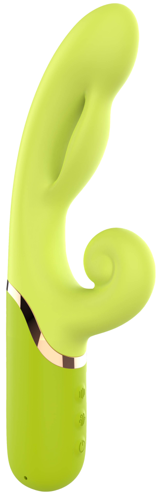 Limetkově zelený vibrátor s buclatou špičkou, zahnutím na bod G a výběžkem na klitoris vás zaujme na první pohled. Na vnitřní straně, pod špičkou hračky je umístěná speciální nafukovací část, která ve vyfouknutém stavu vypadá jako most. Výběžek na klitoris ve tvaru šnečí ulity dobře přiléhá na klitoris. Celkově se vibrátor dobře drží v ruce. Manipulaci s ním proto zvládnete i potmě.
