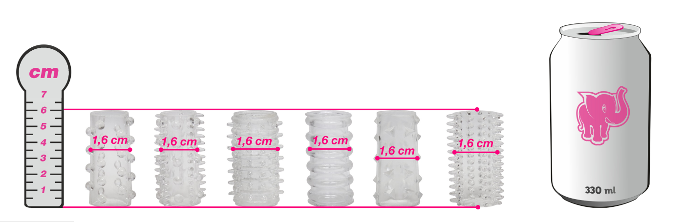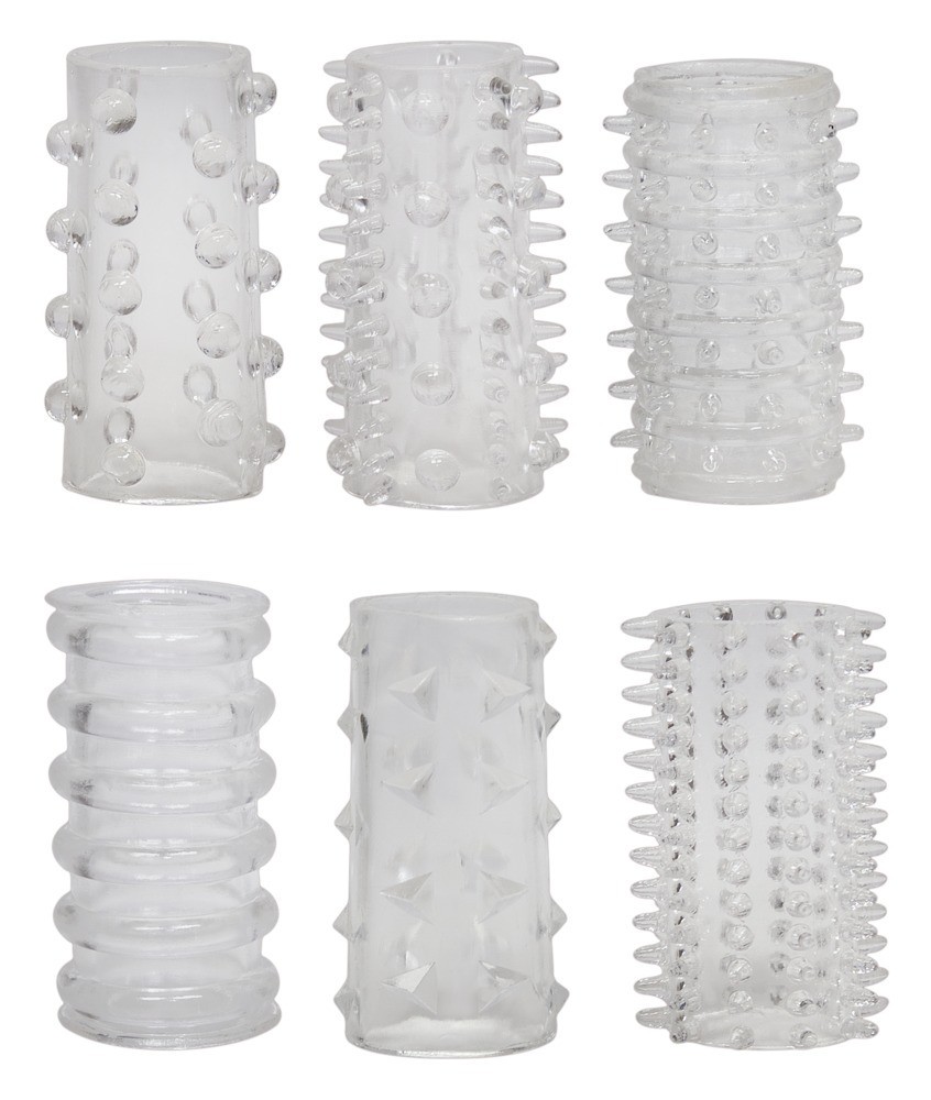 Všech šest návleků má klasický válcovitý tvar, díky kterému se dobře drží a snadno nasazují. Jednotlivé druhy výstupků působí hypnoticky díky křišťálově průhlednému materiálu. Vybrat si můžete návlek s jemnými bodlinami i se zaoblenými hrbolky. Efektivně vypadá i spirálovitá textura nebo vystouplá pyramidová struktura. Záleží na vás, čemu dáte přednost.