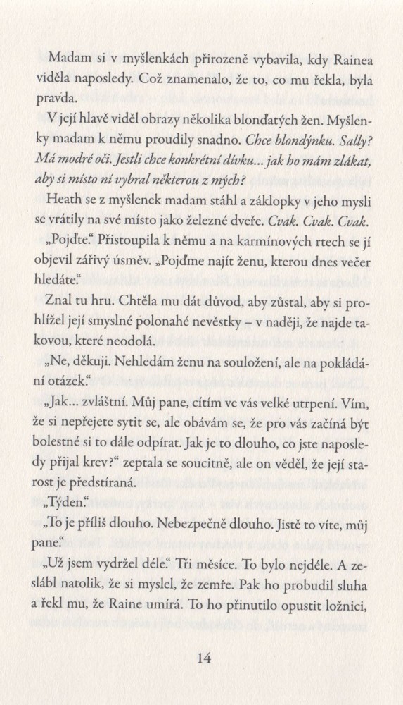 Vivienne zná temná tajemství londýnských mužů. Plní jejich touhy výměnou za moc a postavení uznávané kurtizány. Avšak své vlastní rozkoši a nutkáním, která jí velí, rozumí jen málo. Eroticky neukojená prožívá noc co noc do okamžiku, kdy potká upíra Heatha. Jen on ji dokáže uspokojit a uhasit spalující touhu po extázi. Má to však háček – přísahal, že ji nechá prožít vytoužené uvolnění jen jednou… Heathova touha po Vivienne se vyostřuje ve sladké mučení. Zvlášť když ji krůček po krůčku vede erotickými lekcemi a sleduje, jak se nadšeně vydává na stále vyšší vrcholy rozkoše.