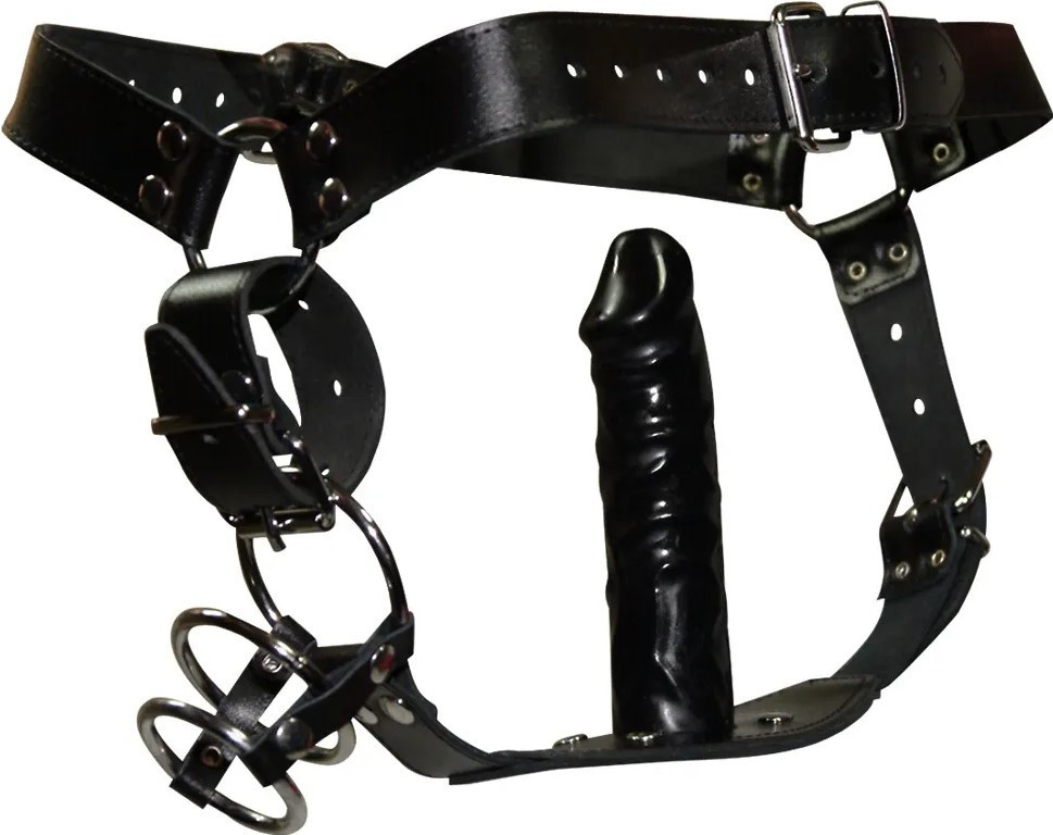 Postroj působí dominantním dojmem a svým designem upoutá pozornost na první pohled. Integrované anální dildo ve tvaru penisu se dobře drží v ruce a při hrátkách nevyklouzne z těla. Jednotlivé popruhy můžete díky opaskovým přezkám povolit nebo utáhnout. Upravíte si tak postroj v oblasti boků a nastavíte si do požadované výšky i anální kolík nebo klícku. Kovová klec se skládá ze tří za sebou spojených kovových kroužků, ve které je uvězněná mužská chlouba připravená na další stimulaci.