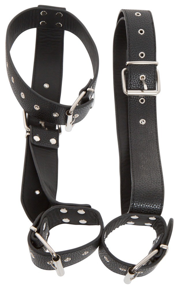 Černý postroj s pouty a obojkem se skládá z několika řemínků a kovových spon. Submisivního partnera proto jednoduše spoutáte stejným způsobem, jakým si zapínáte pásek u kalhot. Pomůcka působí dominantně a snadno se s ní manipuluje. Díky univerzálnímu provedení s několika očky pro zapnutí skvěle sedí většině otroků a otrokyň.