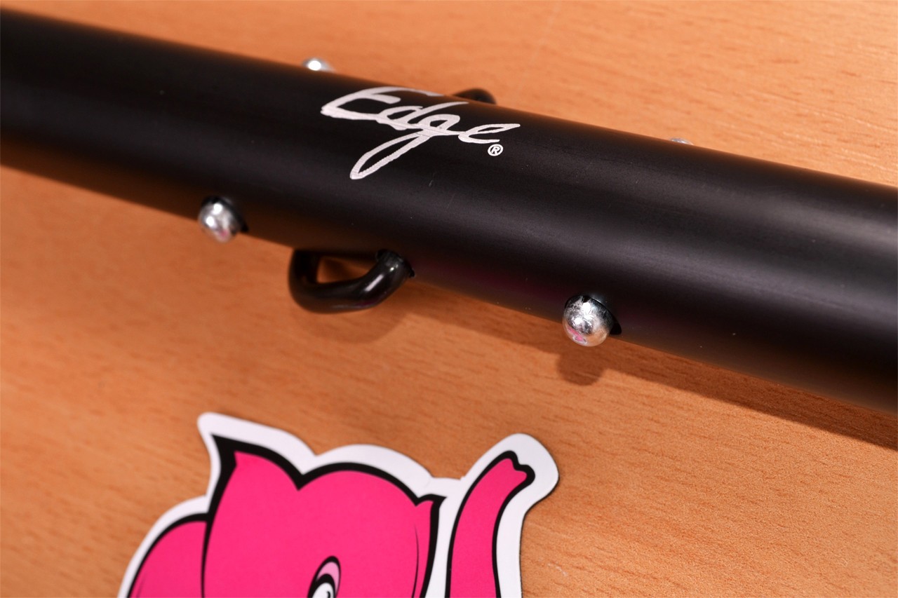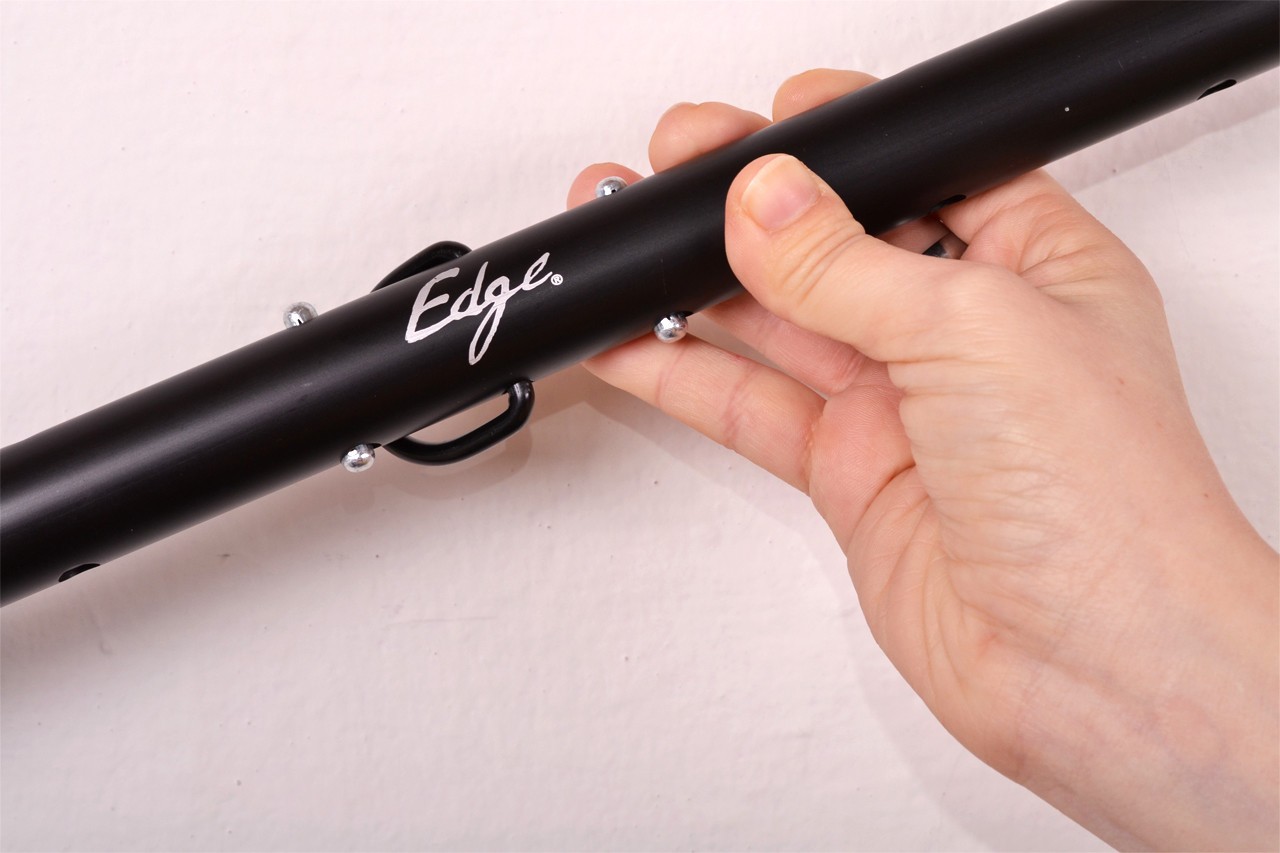 Designově vypadá tyč drsně a zároveň záhadně. Celá černá s bílým nápisem uprostřed. Kovové stříbrné zoubky na roztahování tyče přidávají na designu šmrnc. Navíc manipulace s tyčí je snadná a rychlá.