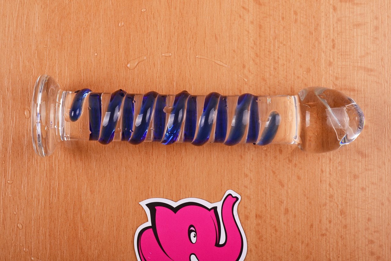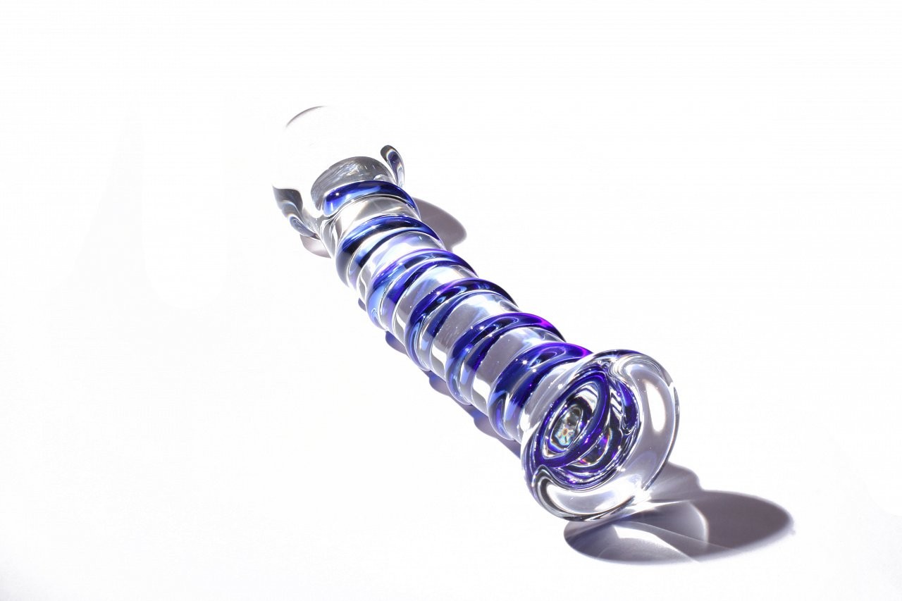 - Průhledné dildo je zdobené nebesky modrými spirálkami