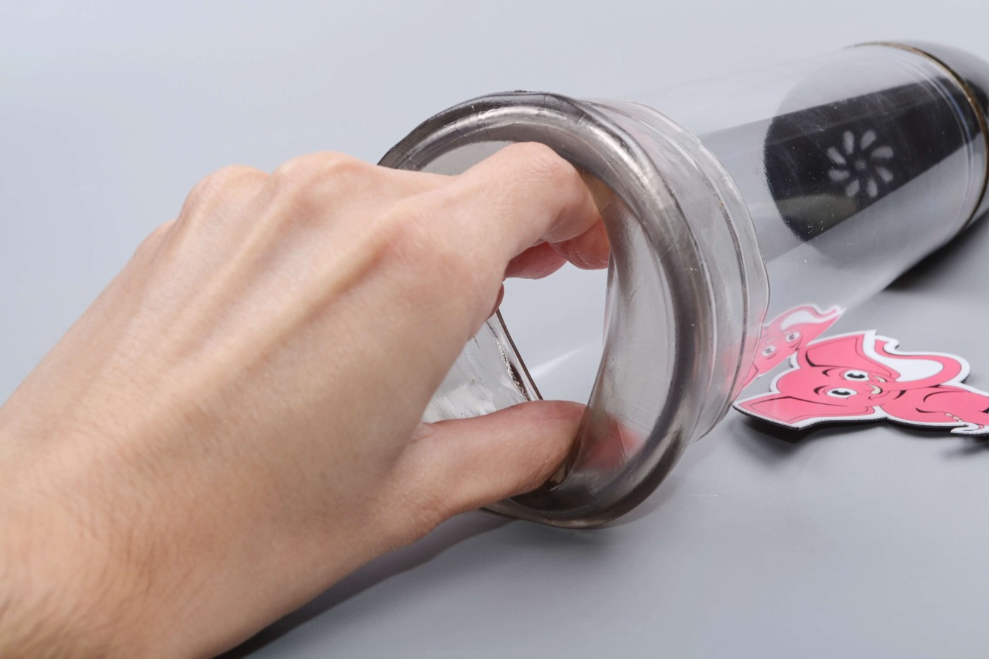 Kombinace černého ovládacího panelu a průhledného válce spolu s černou manžetou nebo broskvově růžovou umělou vaginou vypadá elegantně a moderně.