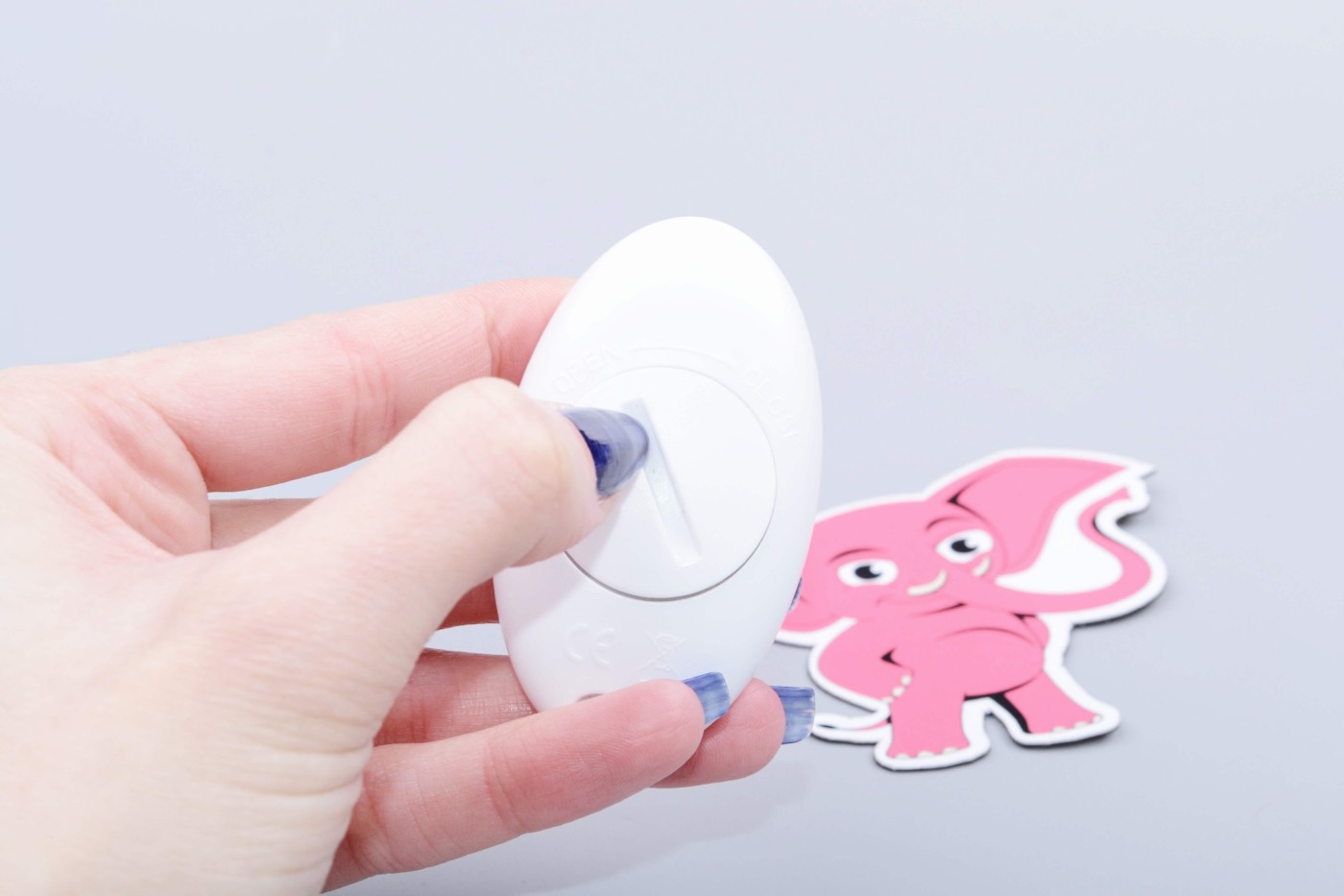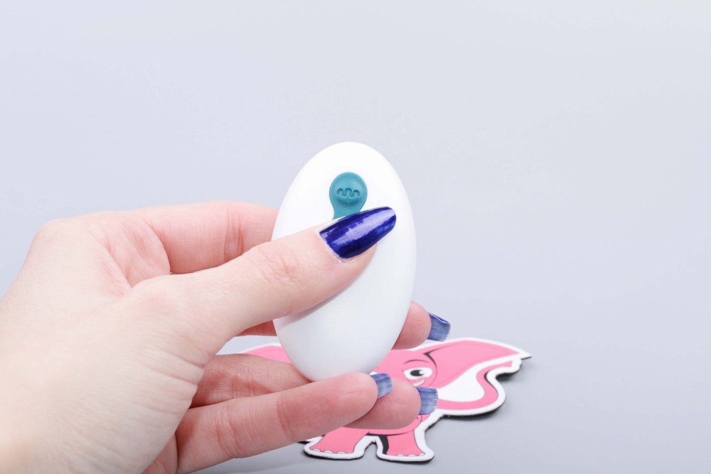 Hračku můžete ovládat i pomocí dálkového ovladače. Nejdřív ji ale nezapomeňte zapnout tlačítkem na kuličce. Ovladač pak zapnete delším podržením tlačítka se symbolem kolečka. Na ovládacím panelu krátce problikne modrá dioda. Vibrační módy přepínáte krátkým stiskem tlačítka se znakem vlnovky.