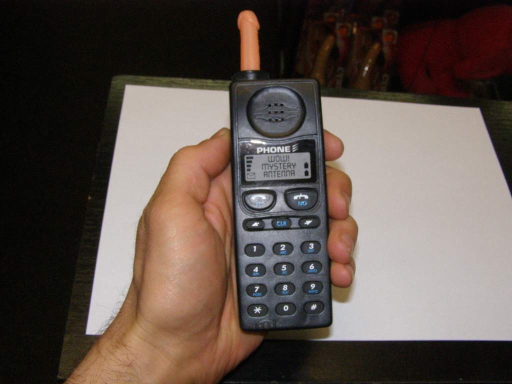 Plastový mobilní telefon staršího data výroby (Ericsson 628?). Po zmáčknutí tlačítka vyskočí malá anténa ve tvaru penisu.